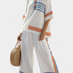 Strukturált frissesség tengeri érzéssel. A Daisy szett tiszta és modern dizájnjával tűnik ki, kézzel készített részletekkel, élénk színekben. A széles blúz és a széles szárú nadrágok laza sziluettet alakítanak ki, amely könnyedséget és stílust sugall egyéni karakterrel.