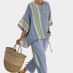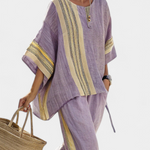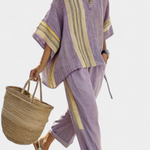 Laza elegancia művészi árnyalattal. A Daisy szett finom levendulával és mustár színű részletekkel kombinálja a természetes frissességet a boho designnal, ideális sétákhoz a tengerparton vagy nyári délutáni kirándulásokhoz kényelmes stílusban.